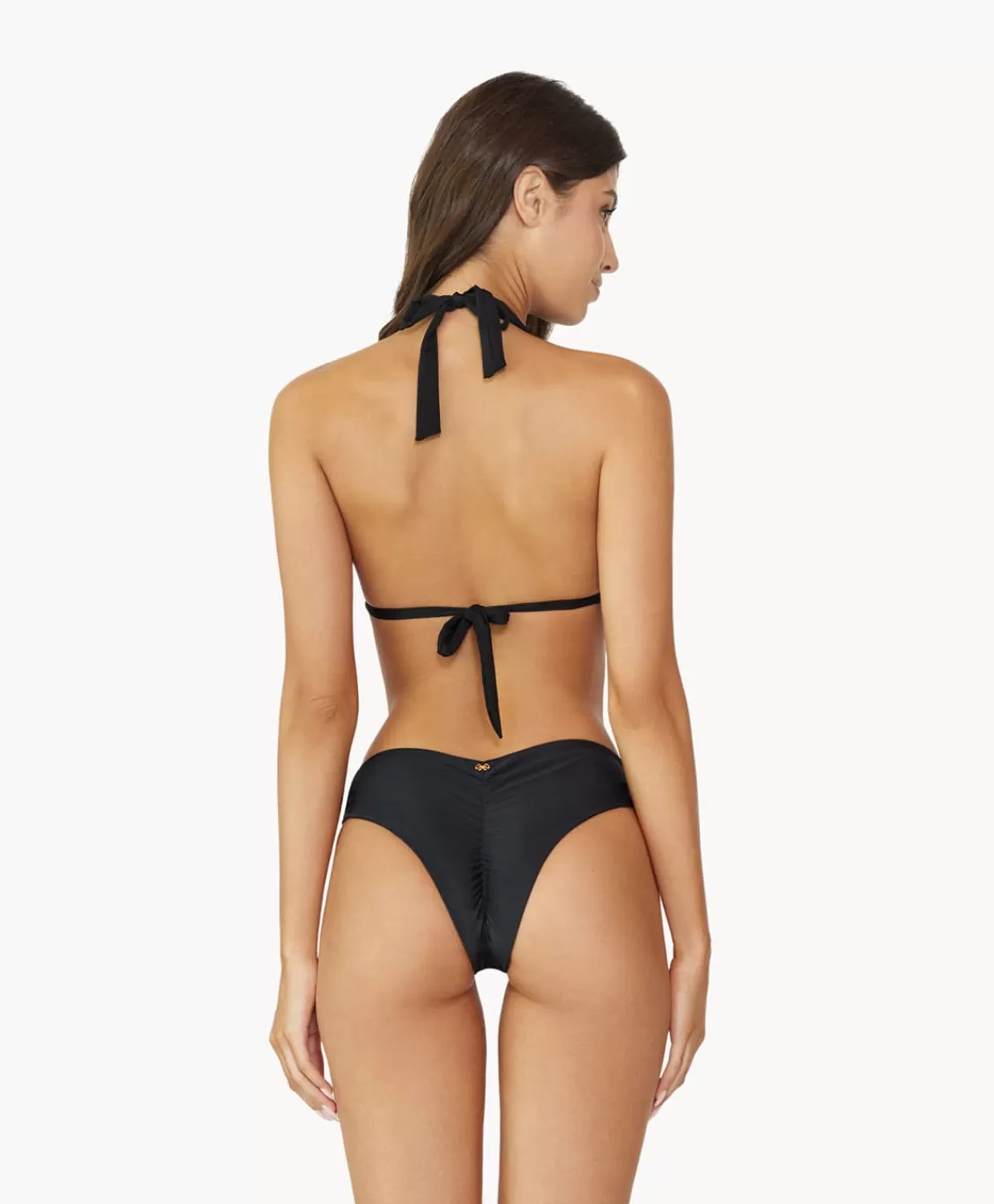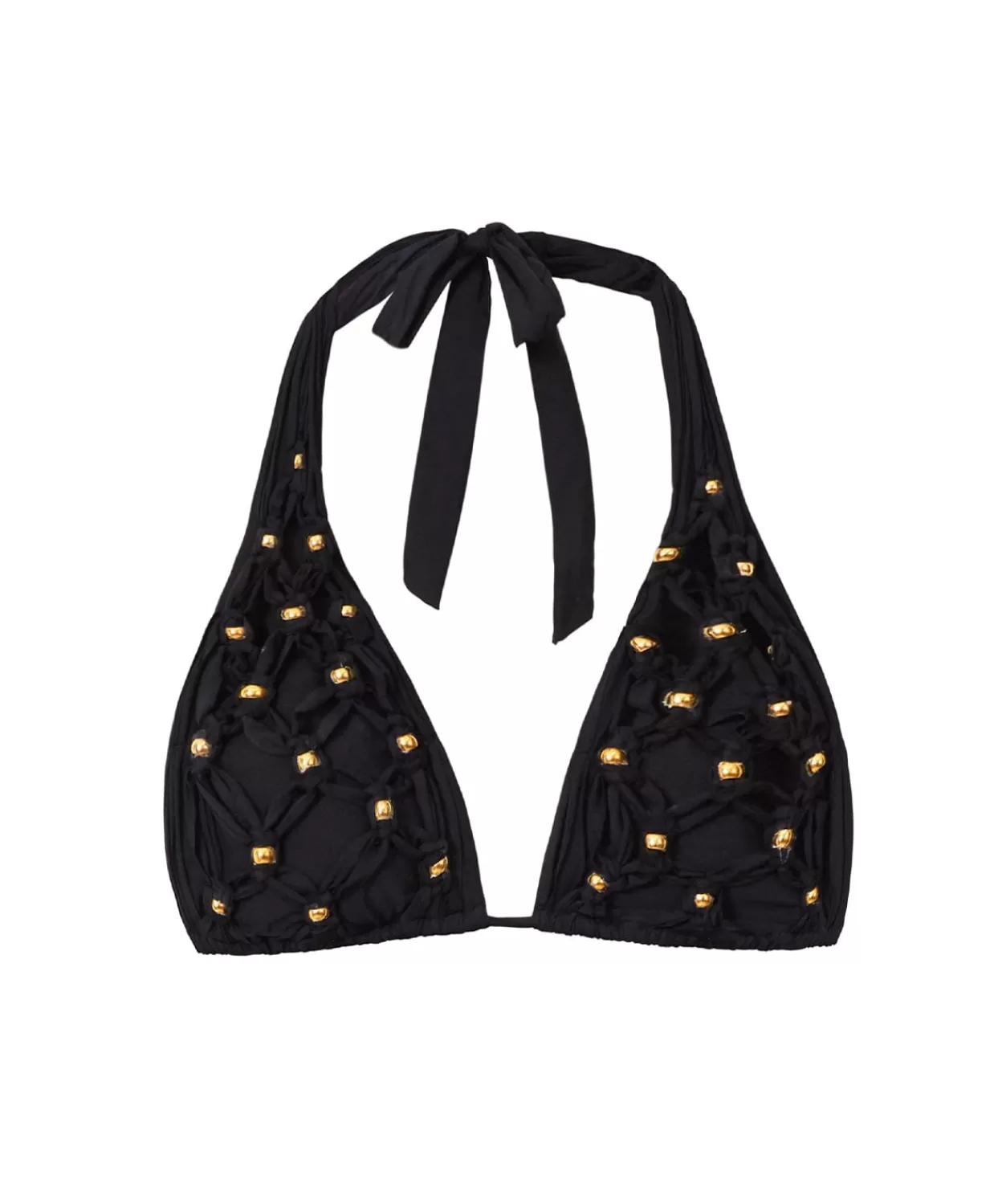 Introducing Our Black Beaded Brynn Halter Bikini Top, A Stunning Piece That Exudes Elegance And Style. This Top Features A Unique Overlay Of Net Macramé, Adding An Intricate And Eye-Catching Detail To This Top. The 24K Gold-Plated Gold Ball Accessories Further Elevate The Design, Providing A Sophisticated And Luxurious Sparkle. Crafted With Care, This Halter Bikini Top Offers Both Comfort And Fashion-Forward Appeal. Mix And Match With Other Bottoms Or Complete The Look With Our Midnight Basic Ruched Bottoms. Includes Removable Padding.